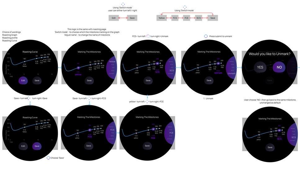 Mapped out the end-to-end process of the AiO machine, separated into 4 main stages; Pre-heating, Roasting, Cooling and Post-Cooling in step by step. Iterated workflows multiple times to simplify navigation and optimize usability for first-time and experienced users.